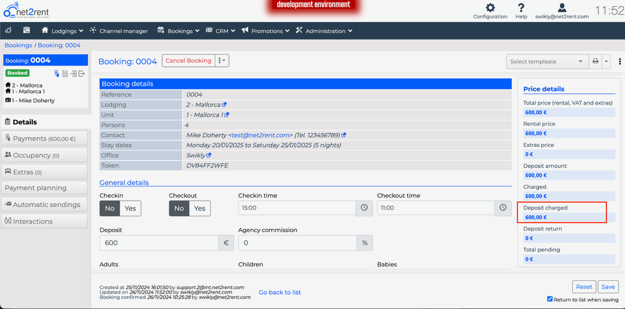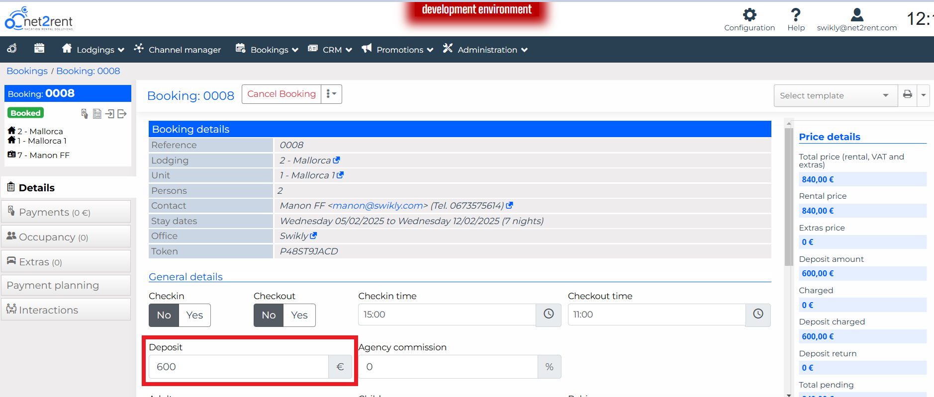 You can check whether the deposit has been successfully made from the booking’s page. In the right-hand menu, the "Deposit charged" field shows the deposit amount when it has been made. Conversely, if no deposit has been recorded, this field will show €0.