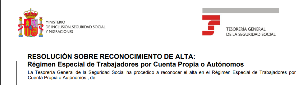 - Documento oficial de prueba de Regimen Especial de Trabajadores por Cuenta Propia o Autonomos" de menos de 3 meses o la tarjeta de identificación fiscal. Ejemplo :