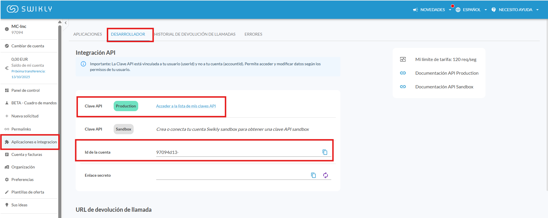 - Desde Swikly, en el menú a la izquierda haga clic en « Applicaciones & Integraciones » y despues en la pestaña "Desarollador" para obtener el ID de la cuenta y la clave API